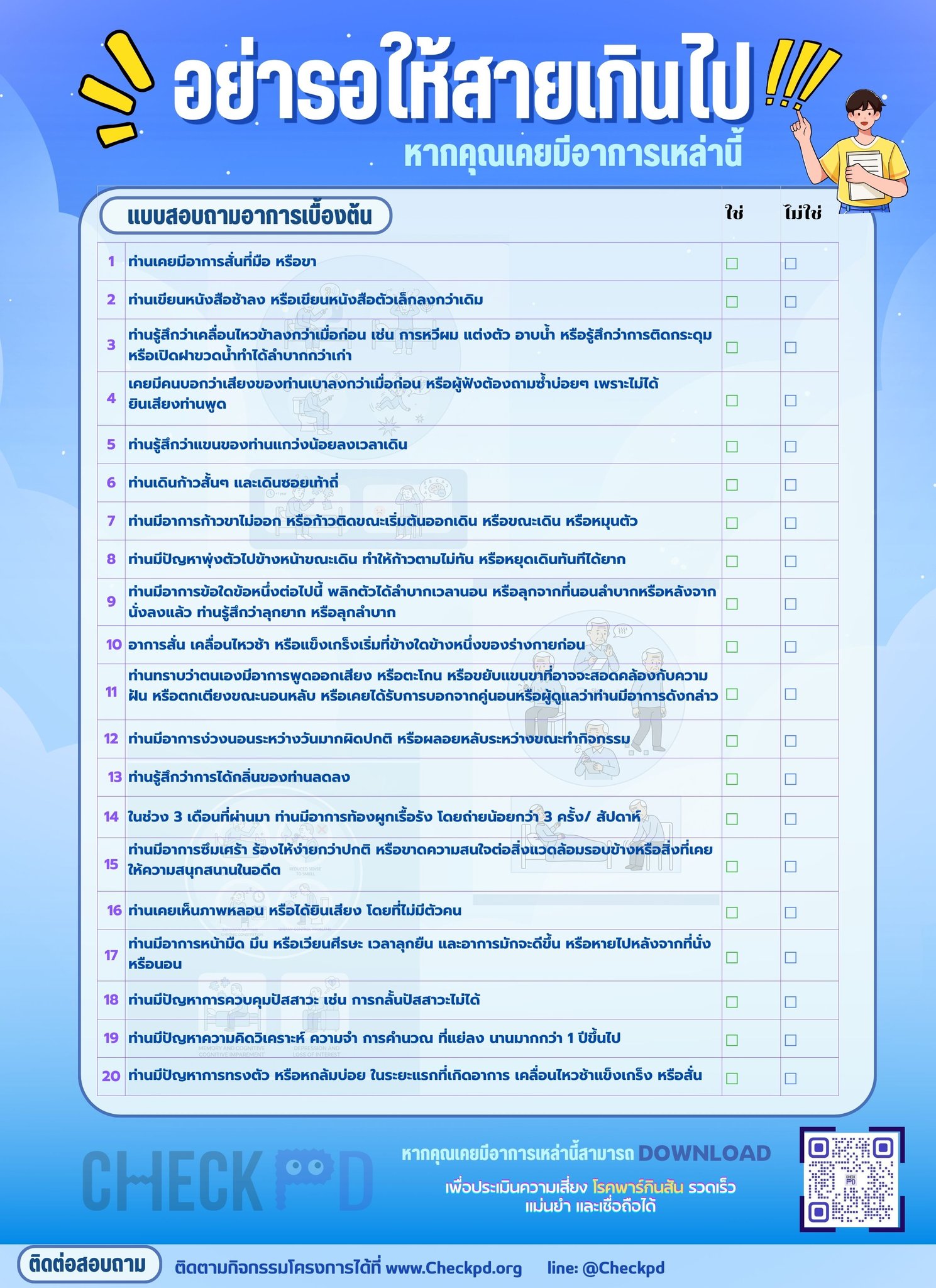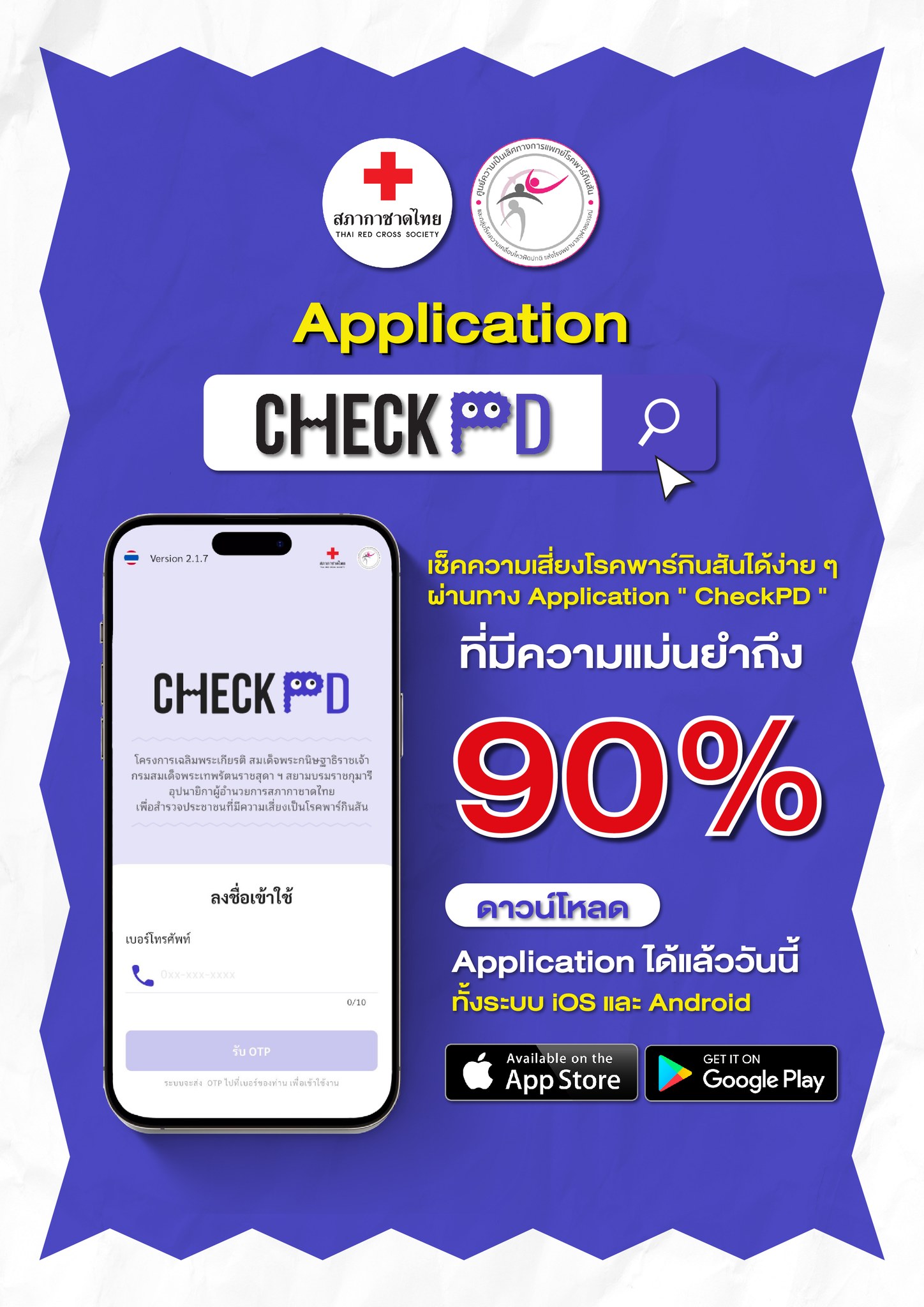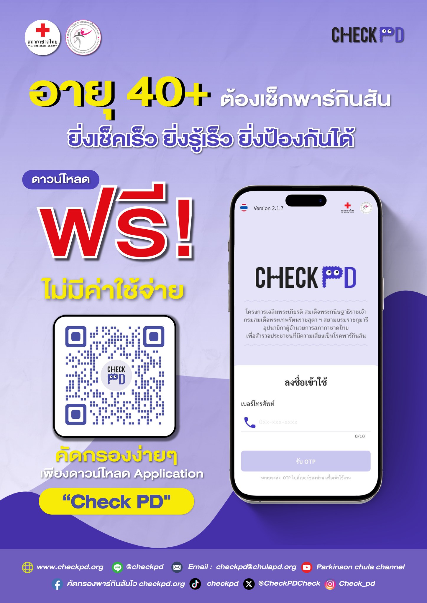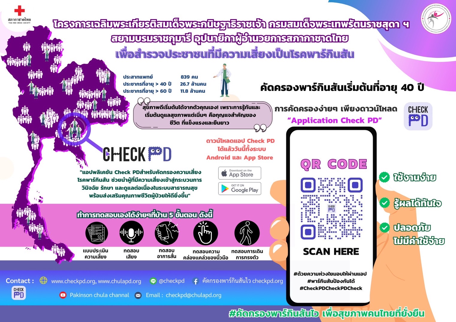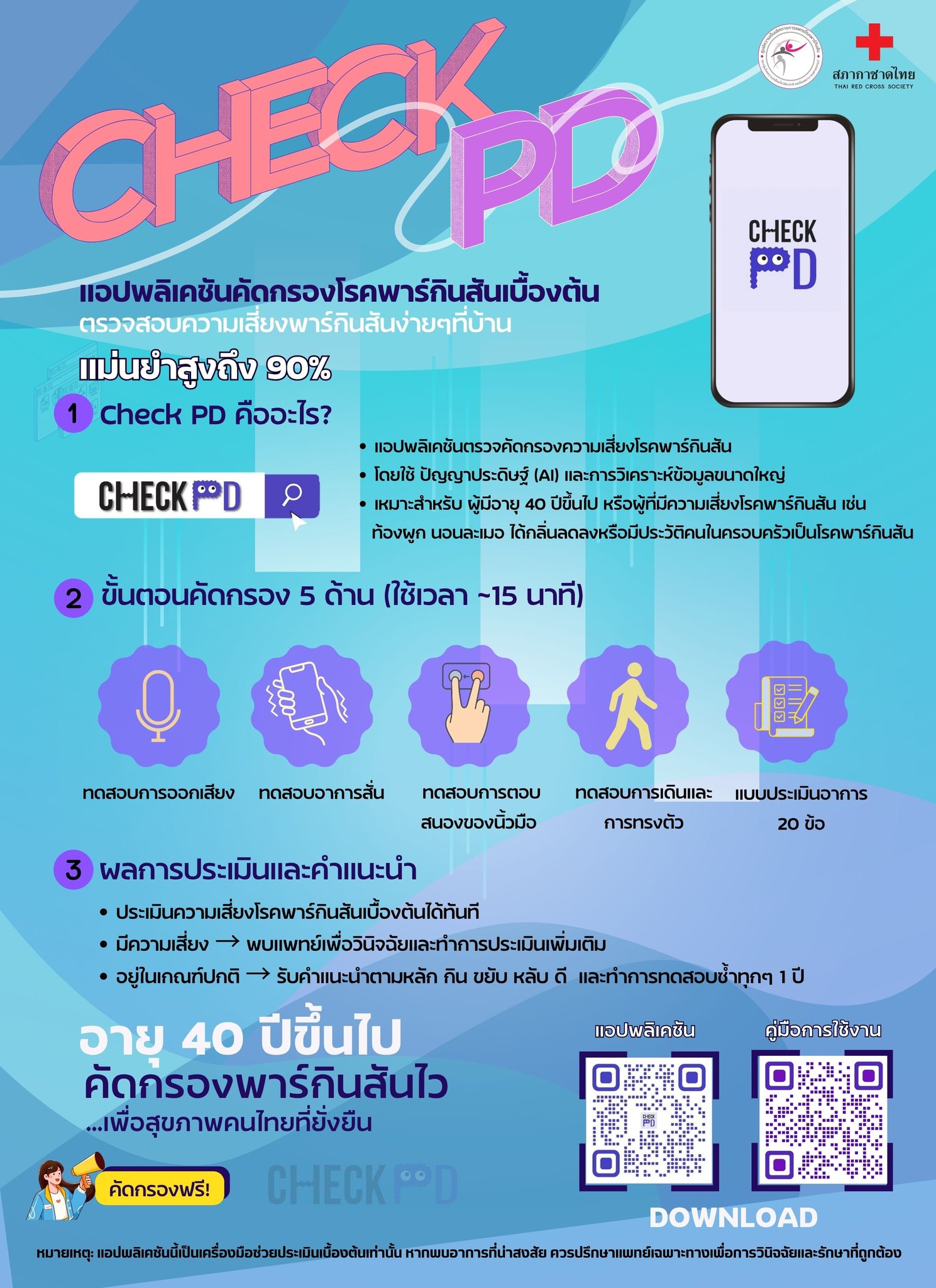 ศูนย์ความเป็นเลิศทางการแพทย์โรคพาร์กินสันฯ สภากาชาดไทย ได้นำเทคโนโลยีดิจิทัลวิเคราะห์ข้อมูลด้วยปัญญาประดิษฐ์ “แอปพลิเคชั่น Check PD” ที่ได้รับการพัฒนาขึ้นเป็นเครื่องมือใช้ในการคัดกรองความเสี่ยงโรคพาร์กินสันเบื้องต้น เพื่อช่วยให้ประชาชนสามารถเข้าถึงระบบคัดกรองความเสี่ยงโรคพาร์กินสันเบื้องต้นได้ด้วยตนเองในทุกพื้นที่ ซึ่งแอปพลิเคชั่นรองรับการใช้งานได้ทั้งระบบ Android / iOS ในปัจจุบันมียอดการดาวน์โหลดและทำการทดสอบผ่านแอปพลิเคชั่น Check PD มากกว่า 30,267 ราย โดยข้อมูลและผลการคัดกรองทั้งหมดจะถูกจัดเก็บไว้ในฐานข้อมูลของสภากาชาดไทย เพื่อใช้ประโยชน์ในการติดตามวิเคราะห์และพัฒนาการดูแลผู้ป่วยโรคพาร์กินสันในอนาคต
