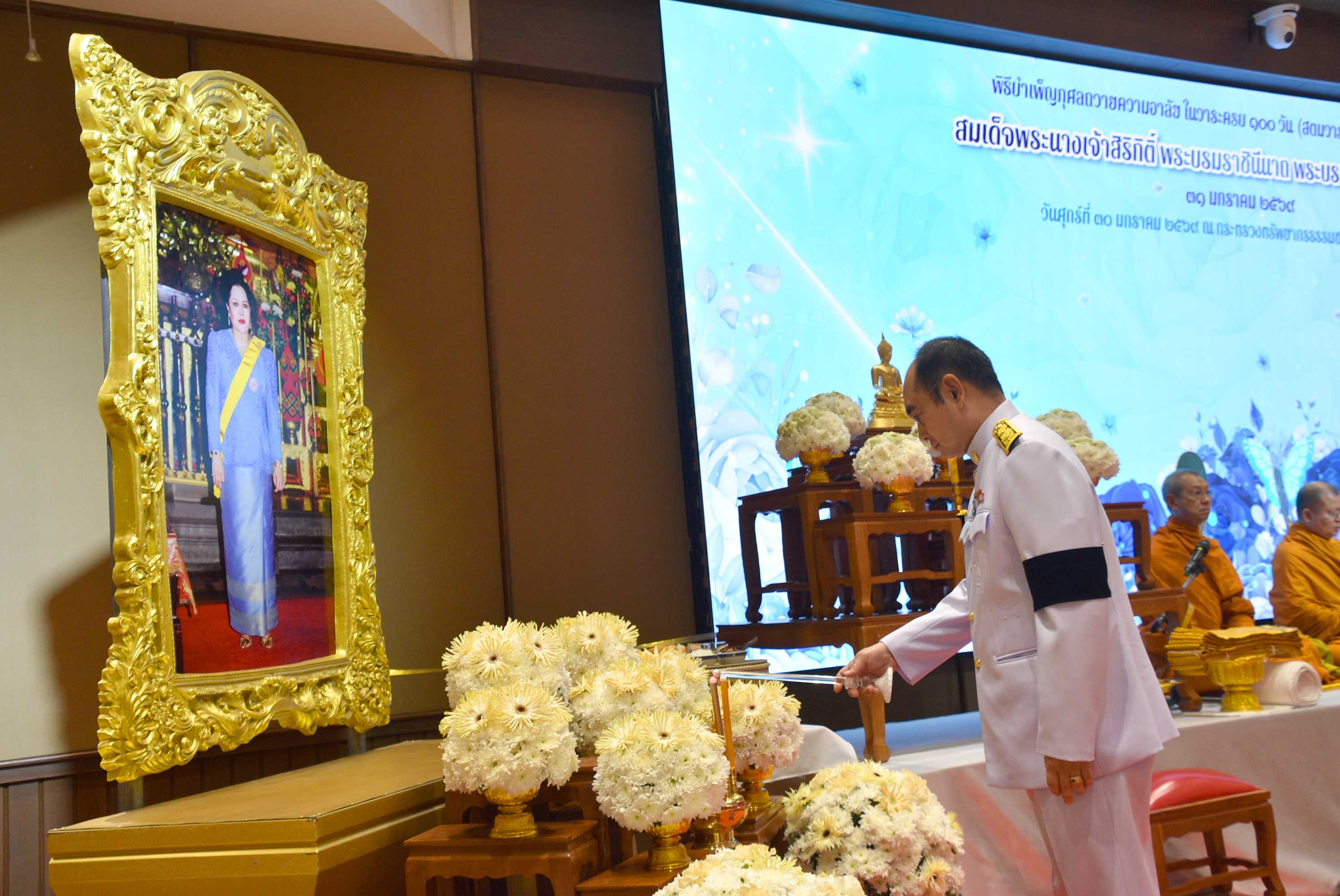 วันที่ 30 มกราคม 2569 ดร.รวีวรรณ ภูริเดช ปลัดกระทรวงทรัพยากรธรรมชาติและสิ่งแวดล้อม ได้มอบหมายให้ นายประเสริฐ ศิรินภาพร รองปลัดกระทรวงทรัพยากรธรรมชาติและสิ่งแวดล้อม เป็นประธานใน “พิธีบำเพ็ญกุศลถวายความอาลัย ครบ 100 วัน (สตมวาร) แห่งการสวรรคตสมเด็จพระนางเจ้าสิริกิติ์ พระบรมราชินีนาถ พระบรมราชชนนีพันปีหลวง” นำคณะผู้บริหาร ข้าราชการ พนักงานรัฐวิสาหกิจ เจ้าหน้าที่ในสังกัด ทส. รวมถึง นายชนุดม เพชรสังข์ รองผู้อำนวยการ รักษาการแทนผู้อำนวยการองค์การอุตสาหกรรมป่าไม้ , นายชาญณรงค์ อินทนนท์ รองผู้อำนวยการ อ.อ.ป. (สายธุรกิจ 2) และคณะผู้บริหารของ อ.อ.ป. เข้าร่วมพิธีบำเพ็ญกุศลถวายความอาลัยฯ ซึ่งตรงกับวันที่ 31 มกราคม 2569 เพื่อถวายเป็นพระราชกุศลและน้อมรำลึกถึงพระมหากรุณาธิคุณที่ทรงมีต่อพสกนิกรชาวไทย โดยการจัดงานพิธีบำเพ็ญกุศลในครั้งนี้ ประกอบด้วย พิธีสงฆ์เจริญพระพุทธมนต์ และพิธีทำบุญตักบาตร ณ ห้องประชุมศักดิ์สิทธิ์ ตรีเดช และบริเวณด้านหน้าอาคารกรมควบคุมมลพิษ กรุงเทพฯ